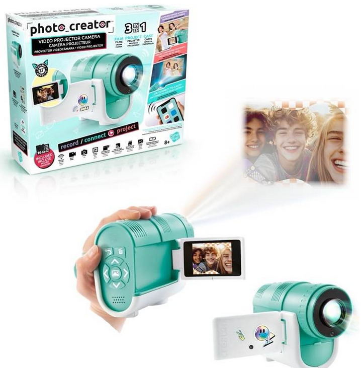 With the 3-in-1 Video Projector Camera from Photo Creator, you can snap photos, shoot crisp HD video, project your creations in colour, and connect to cast your favourite content onto any surface! This exciting all-in-one device projects photos and videos from up to 4 metres, creating a big screen projection display up to 200 x 112cm, with adjustable focus to capture the perfect picture.